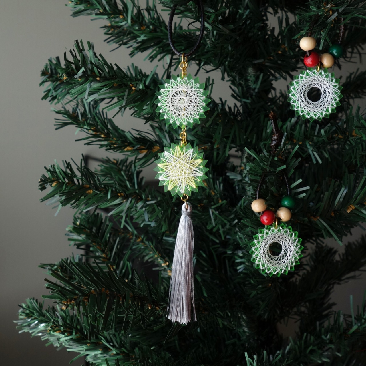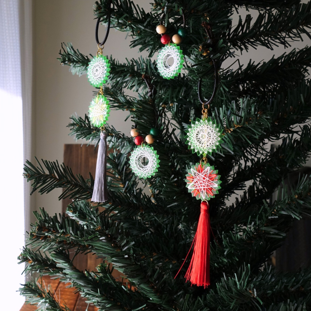 クリスマスカラーのタッセルやウッドビーズと組み合わせ、温かみのあるナチュラルなクリスマスインテリアに仕立てました。