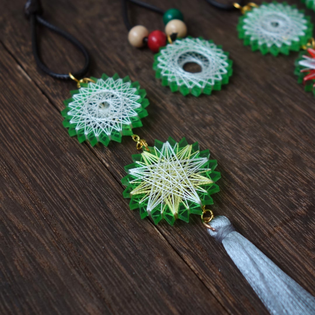 糸をぐるぐると巻きつけて繊細な幾何学模様を描き出すおかもとかもの【糸まき】。子どもの頃に好きだった工作物をベースにして生まれ、3つのこだわりをもって作っています。