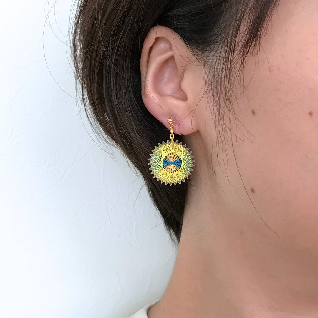 クリアカラーの丸いパーツに、黄色、オレンジがかった黄色、緑がかった青色の3色の絹糸を一本一本丁寧に巻いて作っています。