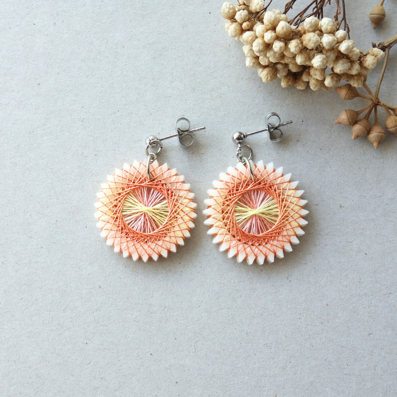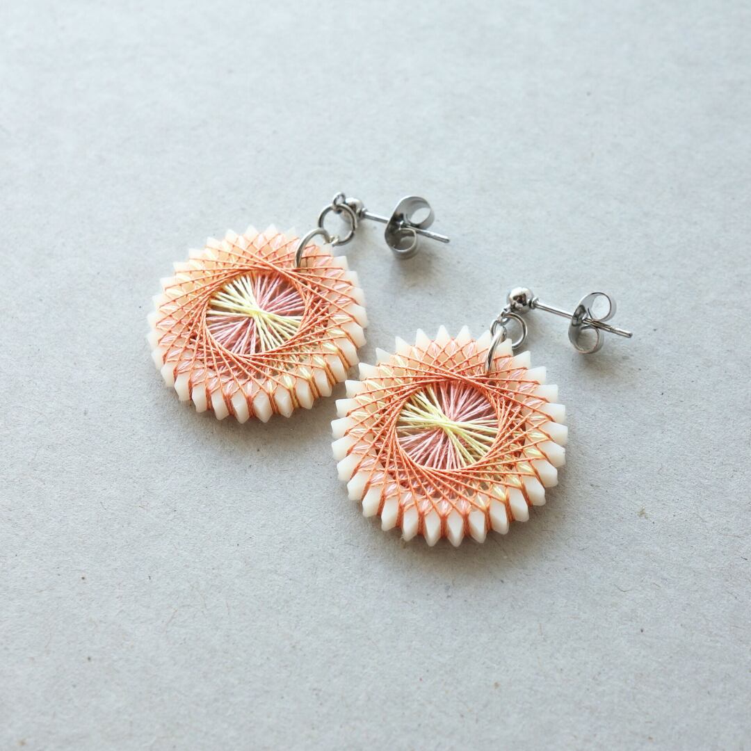 ホワイトの丸いパーツに、サーモンピンク、クリームイエロー、くすみピンクの3色の絹糸を一本一本丁寧に巻いて作っています。