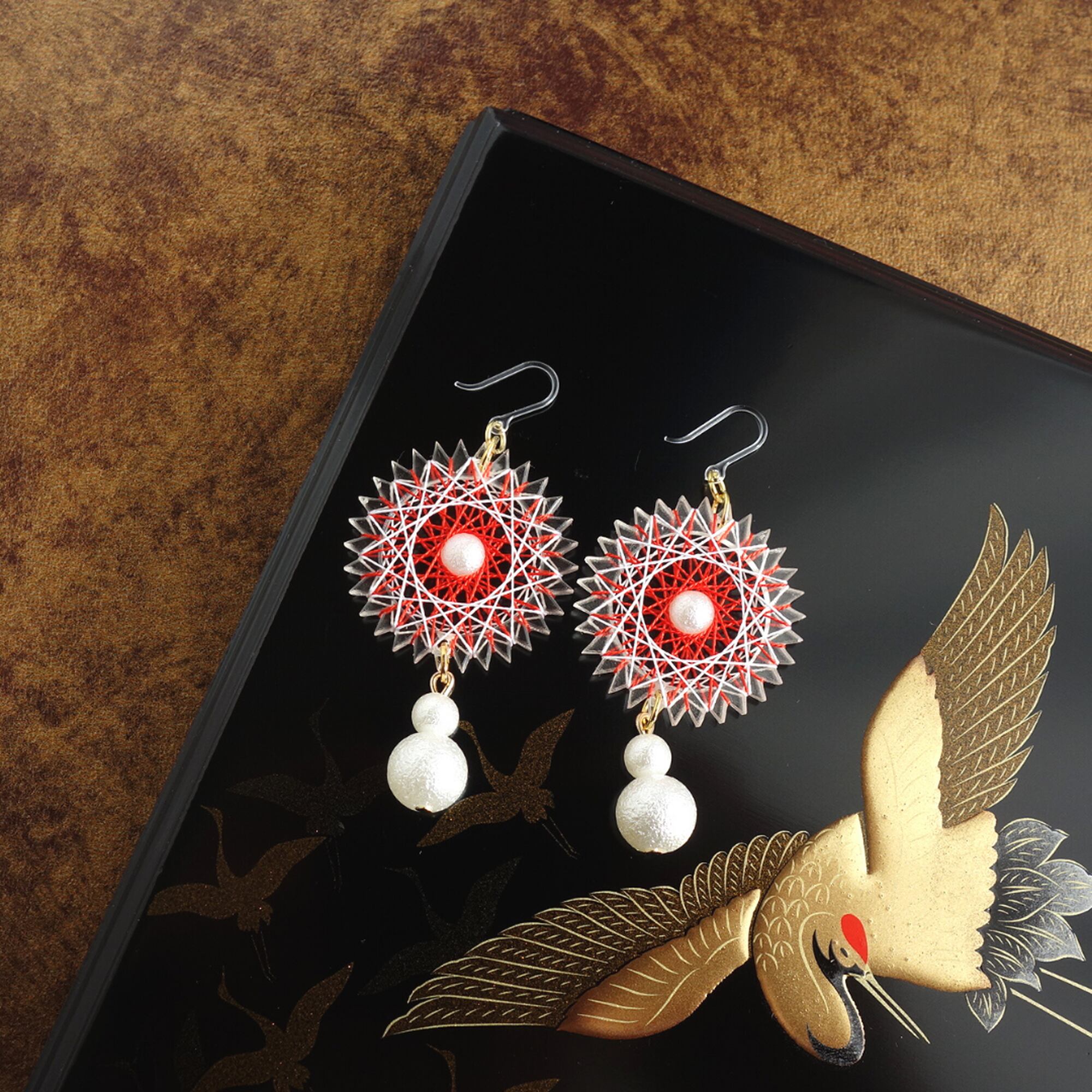 ・ゴールドビーズがきらりと光る「紅白の糸まきイヤリング(金ごま)」