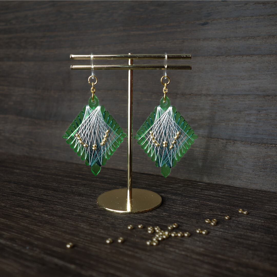 涼し気なグリーンのひし形パーツに、深い緑色と白色の絹糸が美しく映えます。