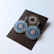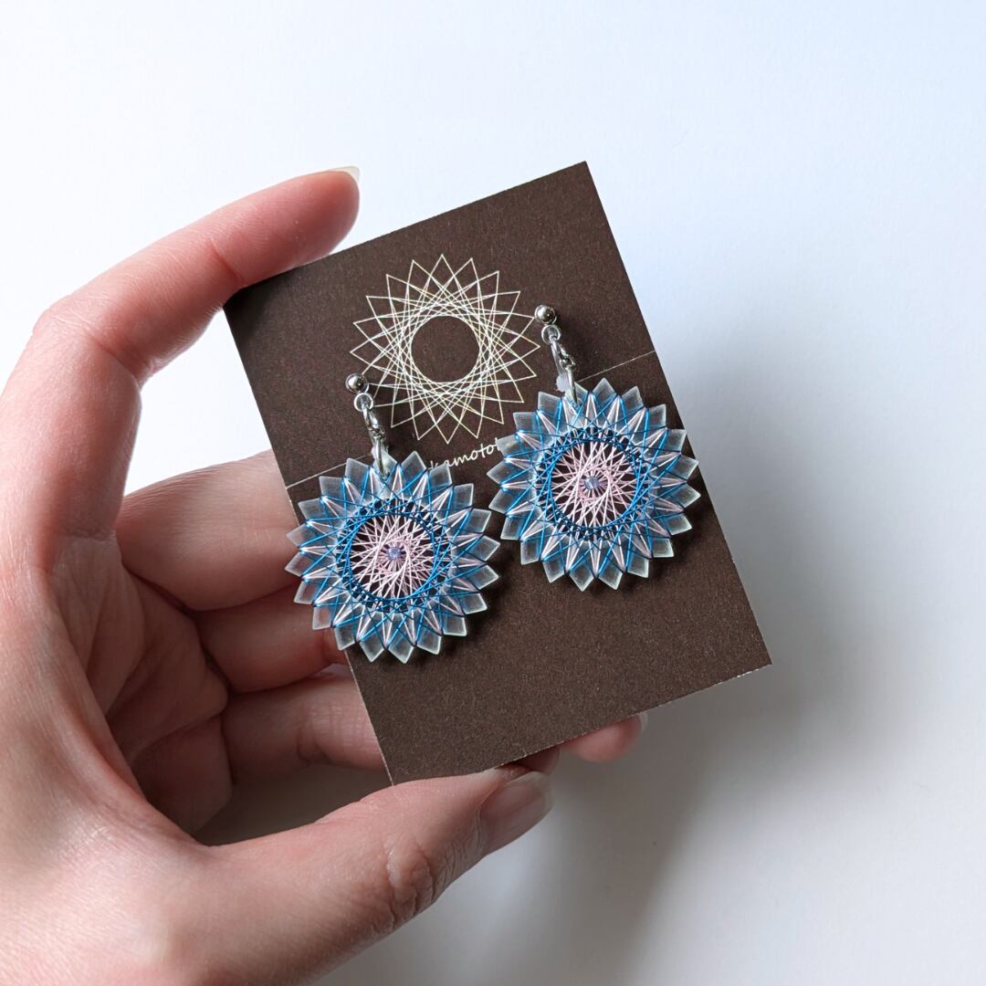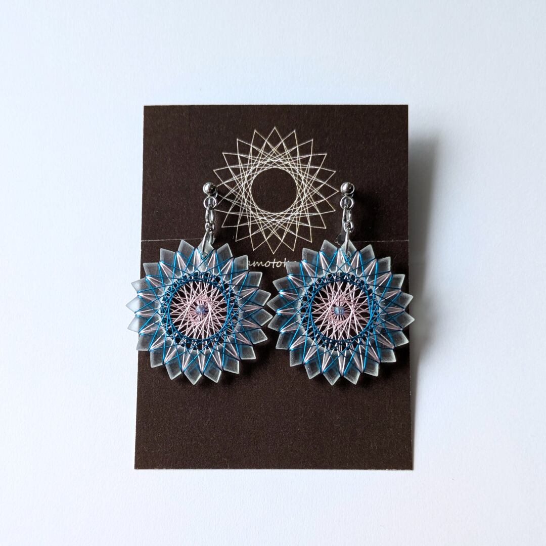 クリアパーツに2色の絹糸を巻き、中央にはオーロラカラーの小粒ビーズをひと粒配置して手作りしました。