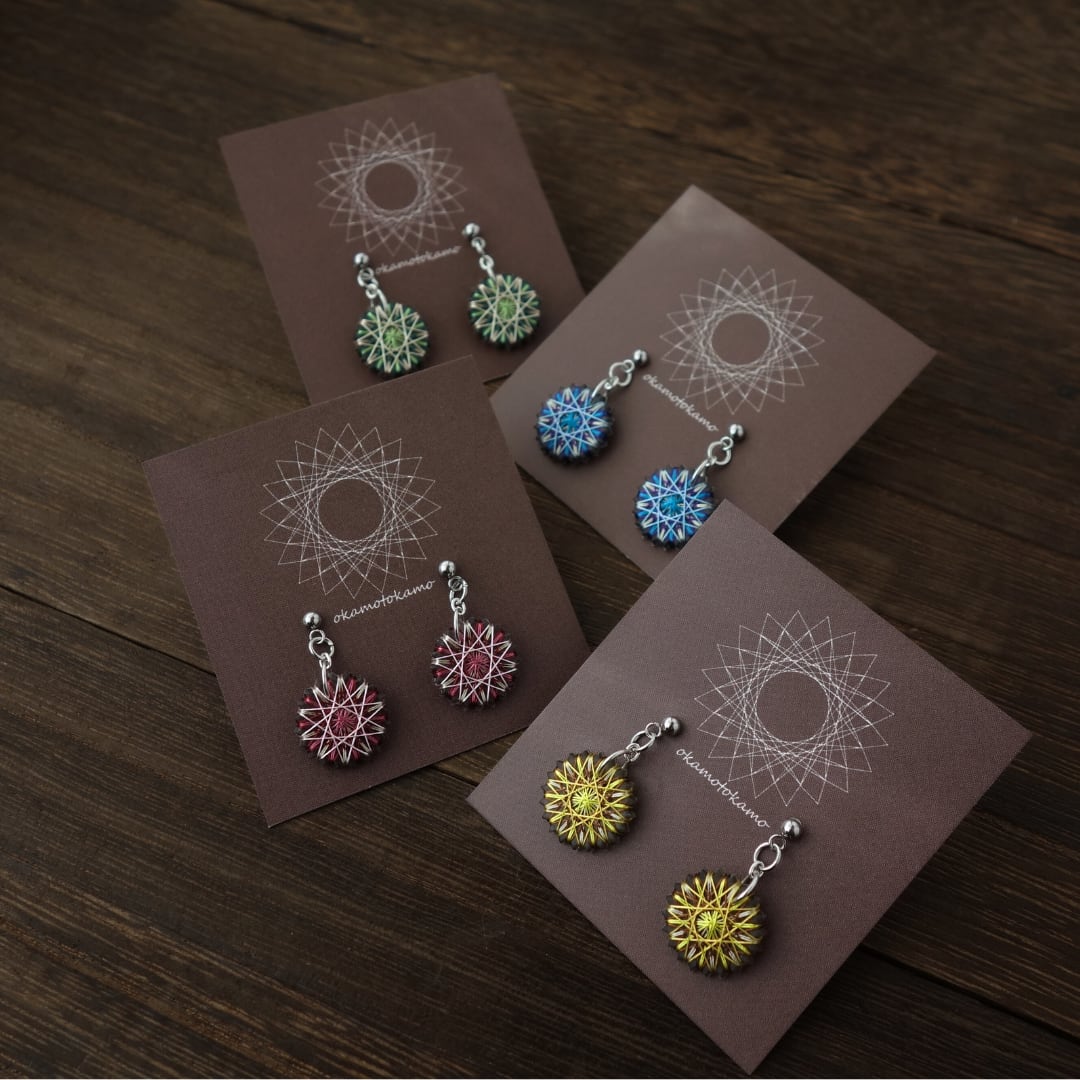糸をぐるぐると巻きつけて繊細な幾何学模様を描き出すおかもとかもの【糸まき】。子どもの頃に好きだった工作物をベースにして生まれ、3つのこだわりをもって作っています。