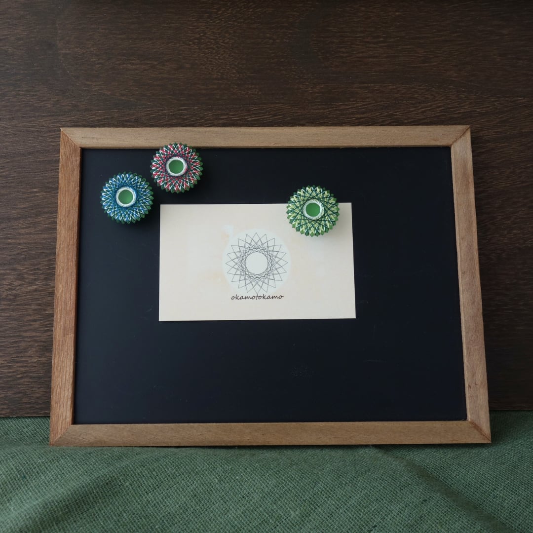 糸をぐるぐると巻きつけて繊細な幾何学模様を描き出すおかもとかもの【糸まき】。「3つのこだわり」をもって、ひとつひとつ手作業で作っています。