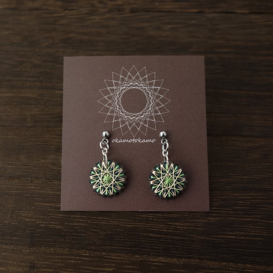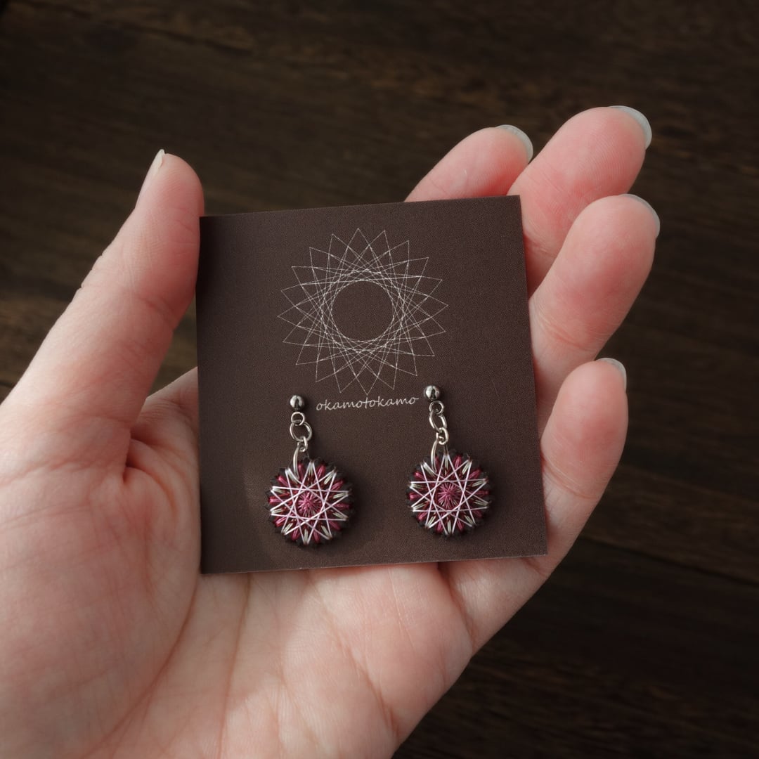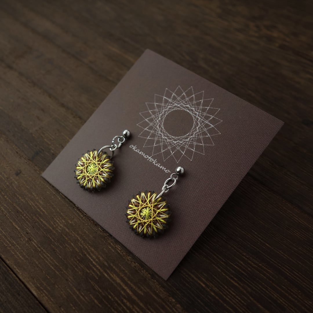 糸をぐるぐると巻きつけて繊細な幾何学模様を描き出すおかもとかもの【糸まき】。子どもの頃に好きだった工作物をベースにして生まれ、3つのこだわりをもって作っています。